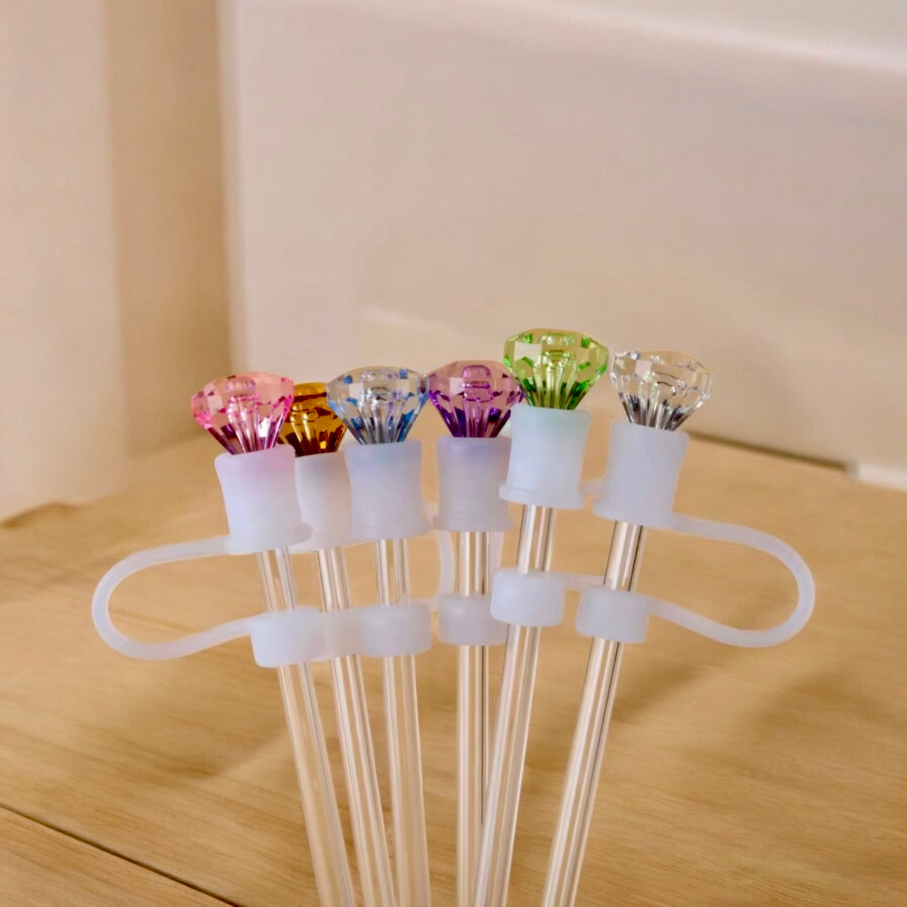 Upgrade your favorite tumbler's visual appeal by acquiring a diamond-shaped straw topper. Constructed from durable acrylic and featuring a rubber base to ensure compatibility with a wide range of tumblers.